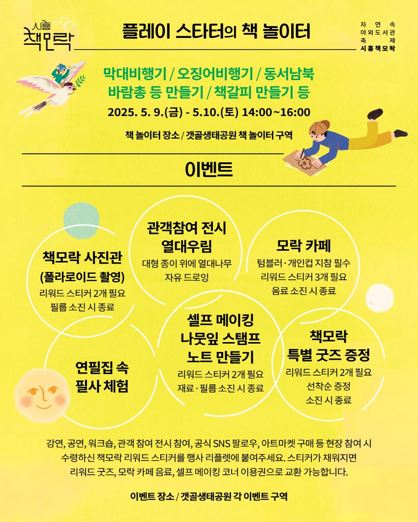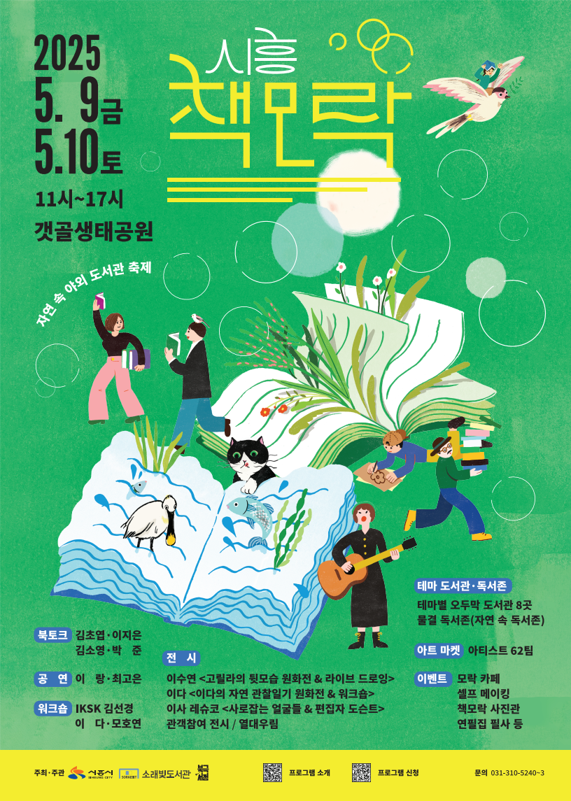 자연 속에서 책과 문화를 함께 즐길 수 있는 특별한 야외 도서관 축제, **‘시흥 책모락’**이 오는 **2025년 5월 9일(금)부터 10일(토)**까지 시흥 갯골생태공원에서 개최됩니다.
