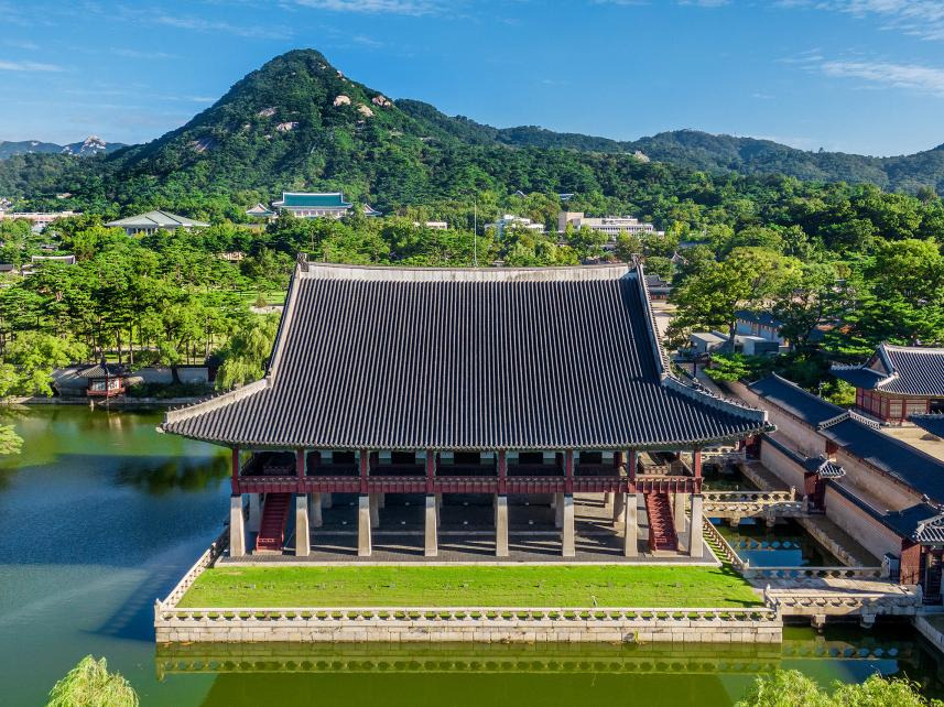 - 연못 너머로 펼쳐지는 북악산과 경복궁의 절경 감상