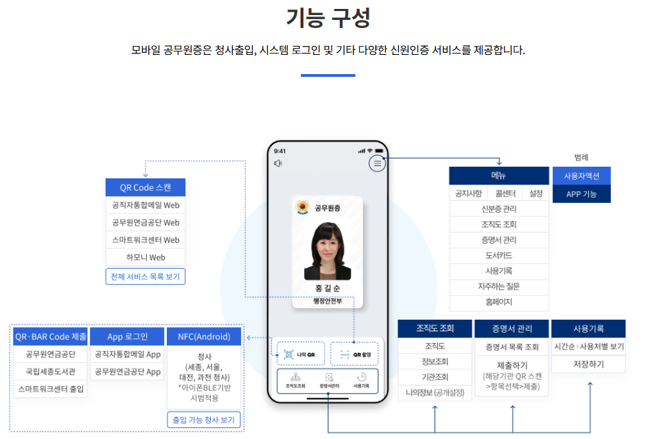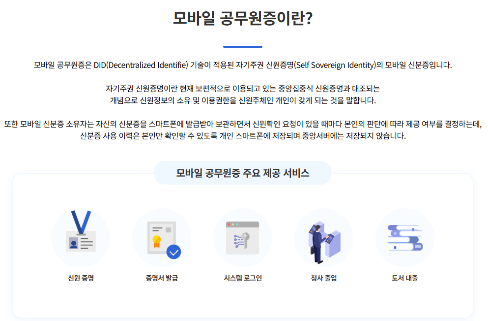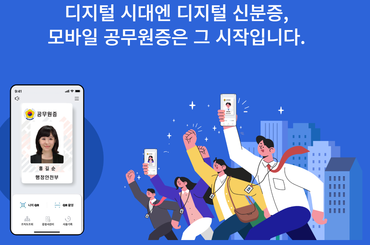 모바일 공무원증은 공무원 신분증을 디지털화한 형태로, 스마트폰을 통해 신분 확인, 청사 출입, 내부 시스템 로그인을 간편하게 할 수 있는 서비스입니다.