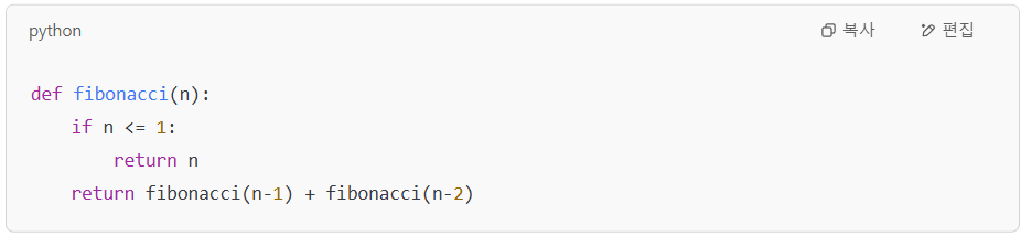 - return fibonacci(n-1) + fibonacci(n-2): 재귀 호출을 통해 이전 두 항을 합산